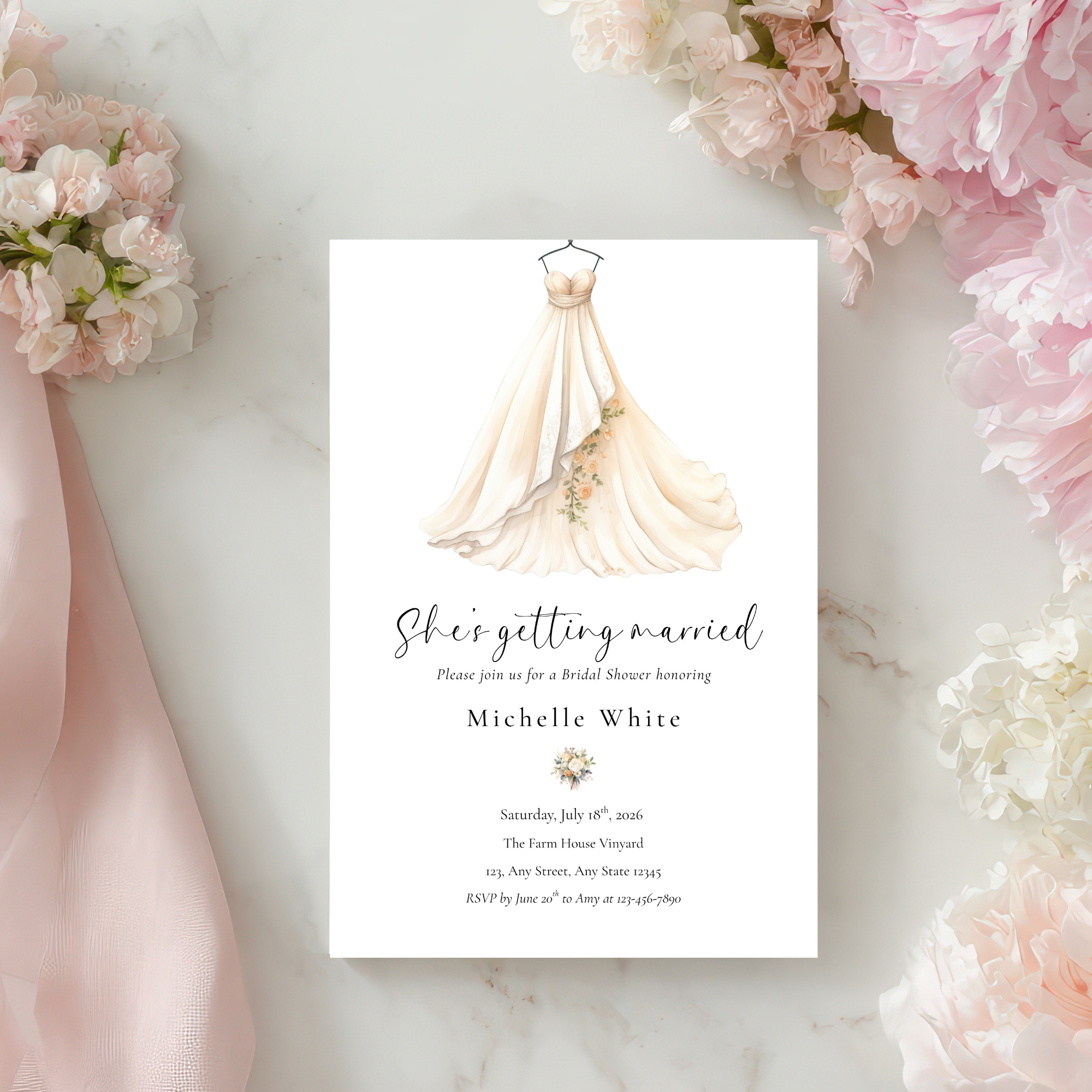 Celebrate the bride-to-be with this elegant “She’s Getting Married” bridal shower invitation—featuring soft neutral tones, romantic bridal artwork, and timeless modern typography.